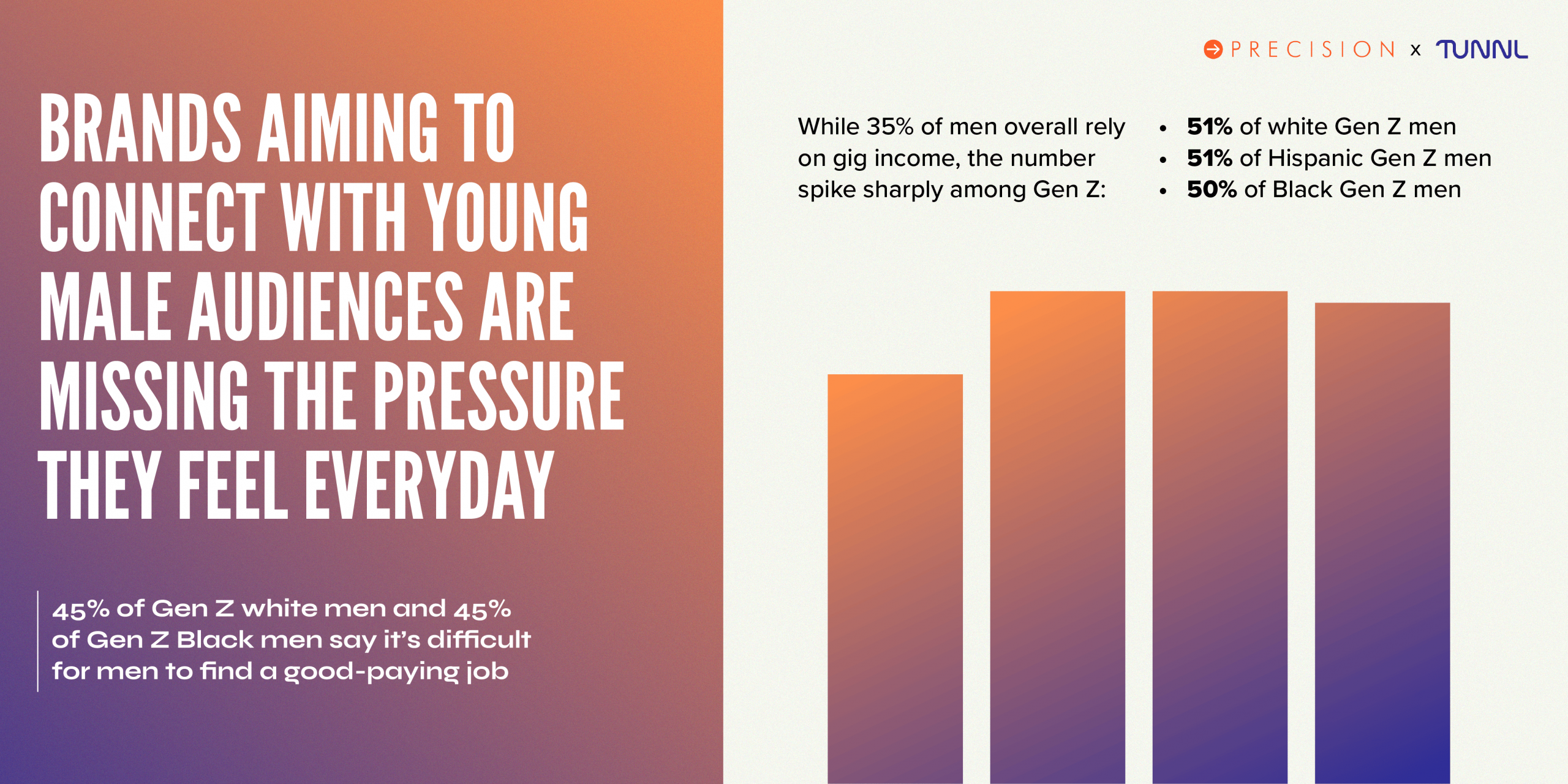 From these two bodies of work, Tunnl and Precision developed a series of generational and behavioral segments that group audiences by the stories they engage with, the platforms they trust, and the pressures they feel. These segments underscore a critical finding: men are not monolithic, and the factors shaping their identities are both deeply personal and structurally patterned.